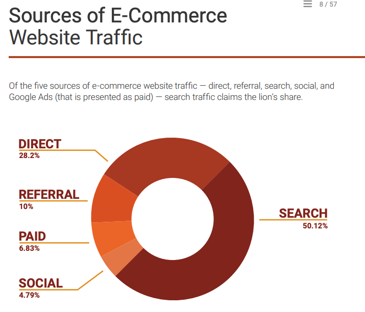 根據美國大型行銷軟體SEMrush在2018年提供的「年度電商研究報告」顯示,有超過50.12%以上的電商網站流量,都是來自自然搜尋。(見下圖)